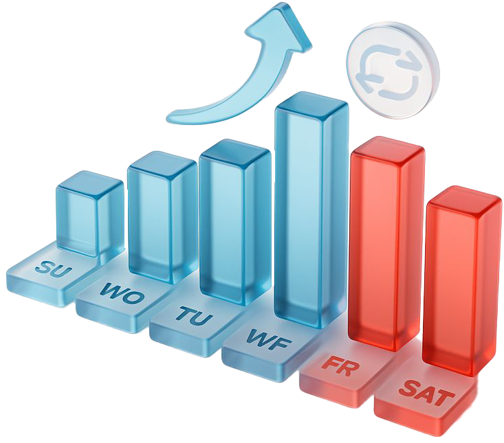 يعكس هذا التحليل حركة النظام خلال الأسبوع ويكشف الأيام اللي يتفاعل بيها السوق بأعلى طاقته. بعض الأيام تجيب زخم واضح، وبعضها تمنح استقرار واتجاهات نضيفة تساعد النسخ الفوري يشتغل بأفضل أداء. الأربعاء يبرز كأقوى يوم دخول… والإثنين يثبت نفسه كأكثر يوم يحقق أرباح أما بقية الأيام فتبقى متوازنة وتعكس سلوك النظام