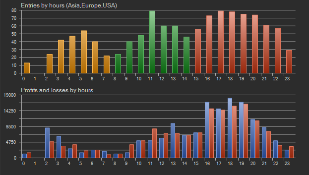 يتّضح من الرسم أن منتصف اليوم الأوروبي وبداية الأمريكي هي الفترات الأكثر نشاطاً، بينما تكون الساعات الأولى من الافتتاح أقل وضوحاً نتيجة التذبذب